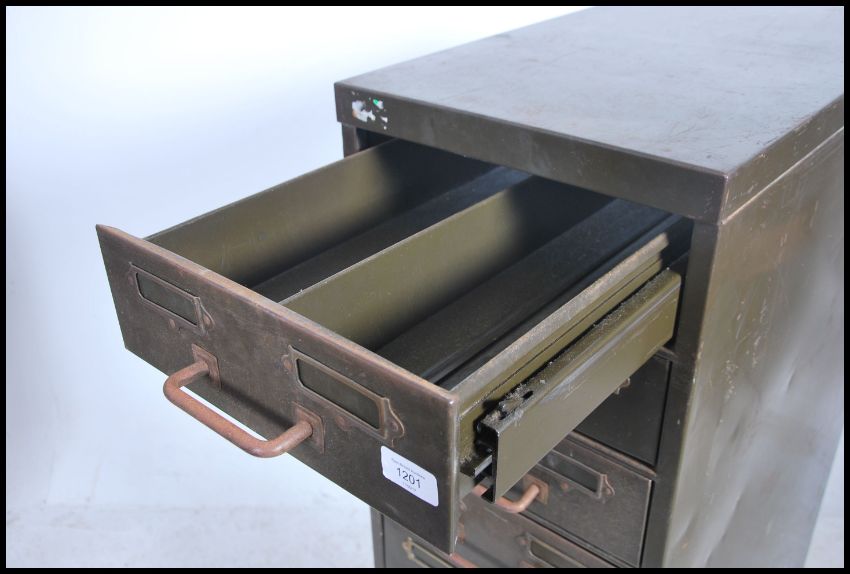 A good 1930's Industrial Factory filing stationary cabinet of pedestal form with 11 drawers all having pull handles and notation slides. Measures height 131cm x width 35cm x depth 67cm.