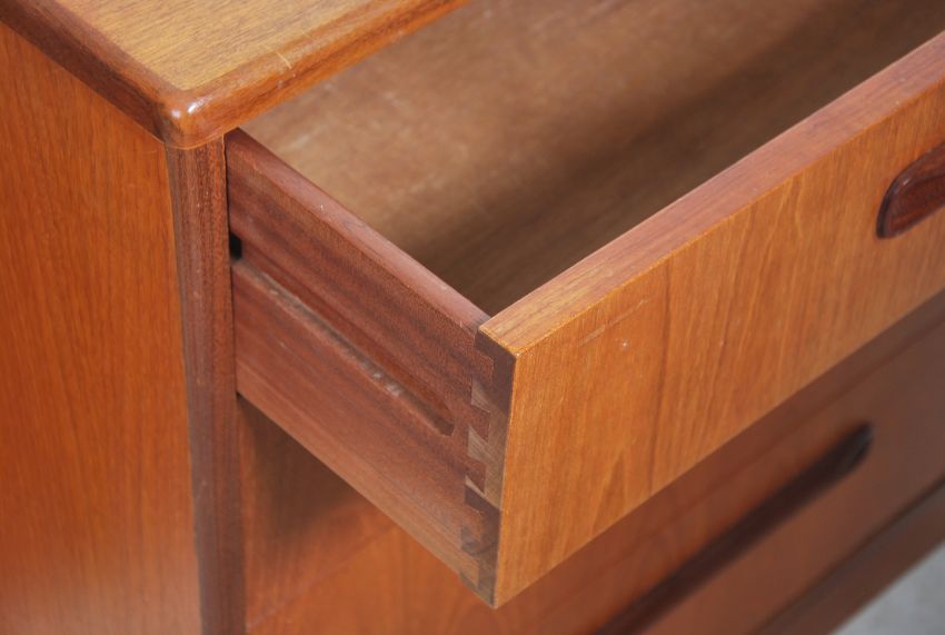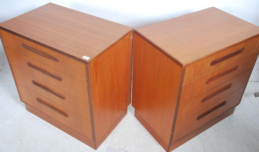 A pair of retro 1970's G-plan teak wood ' Kelso ' pattern bedside chest of drawers having inset plinth base, the drawers with recessed handles. Measures height 75cm x width 72cm x depth 45cm.