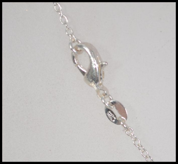 A silver 925 cz adorned roundel modernist pendant and necklace chain. The pendant of roundel form adorned with baguette cut cz stones. Size 45cms length chain / pendant 3.5cms high / total weight 7.9g