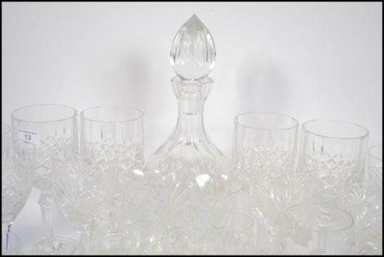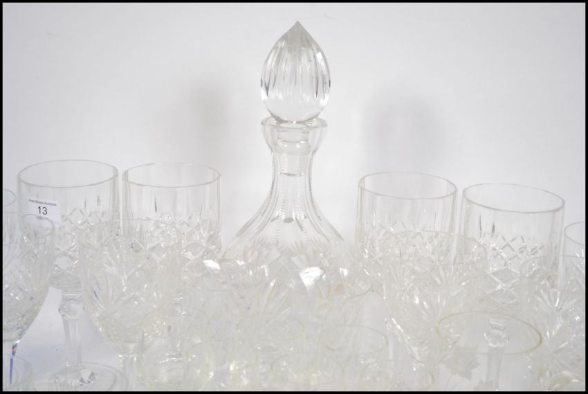 A good collection of cut glass to include decanter and 6 wine glasses, brandy and sherry glasses, large cut glass wine goblets many names to include Dartington etc. The decanter measures 31cm high.