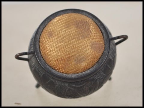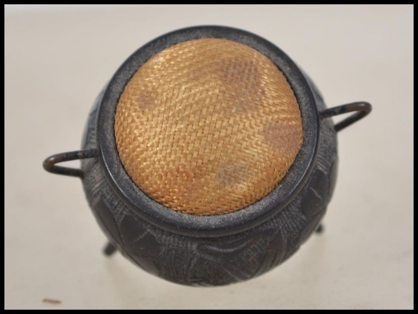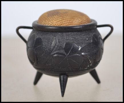 A stunning 19th century bog oak pin cushion in the form of a cauldron being raised on tapering 3 legs with twin handles to the cauldron. Measures 3cm high.