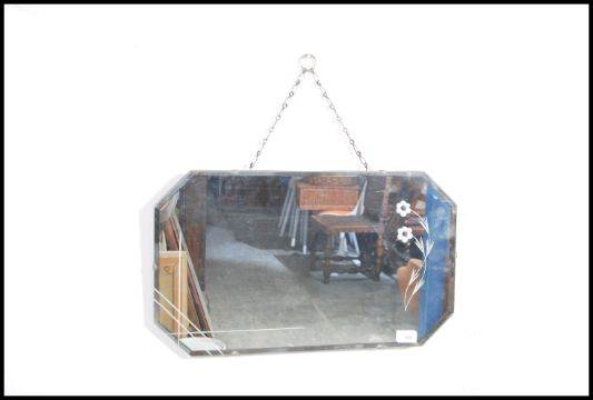 A vintage mid 20th century frame-less wall mirror having an etched decoration to the mirror. Measures height 33cm x width 56cm.
