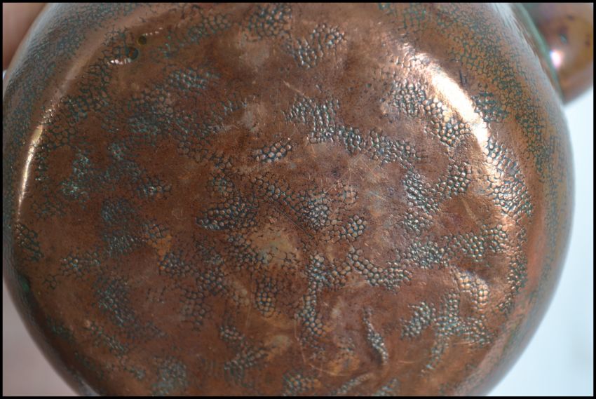 An unusual Chinese copper teapot with chased decoration and character marks , short spout and lid.