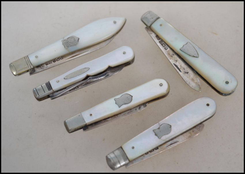 A collection of five silver hallmarked fruit / folding knives all with mother of pearl grips, four with Sheffield assay marks and the other with a Birmingham Sheffield mark. Makers to include C W Fletcher & Son Ltd (Charles William Fletcher), John Yeomans Cowlishaw, Mappin Brothers, William Needham and Villiers & Jackson.