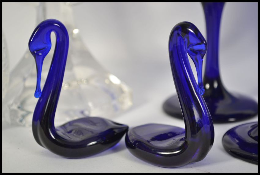 A good group of glassware to include a pair of Bristol Blue swans, a set of 8 blue glass wine goblets, a twin sconce candle holder and an eagle paperweight. The tallest measures 11cm high.