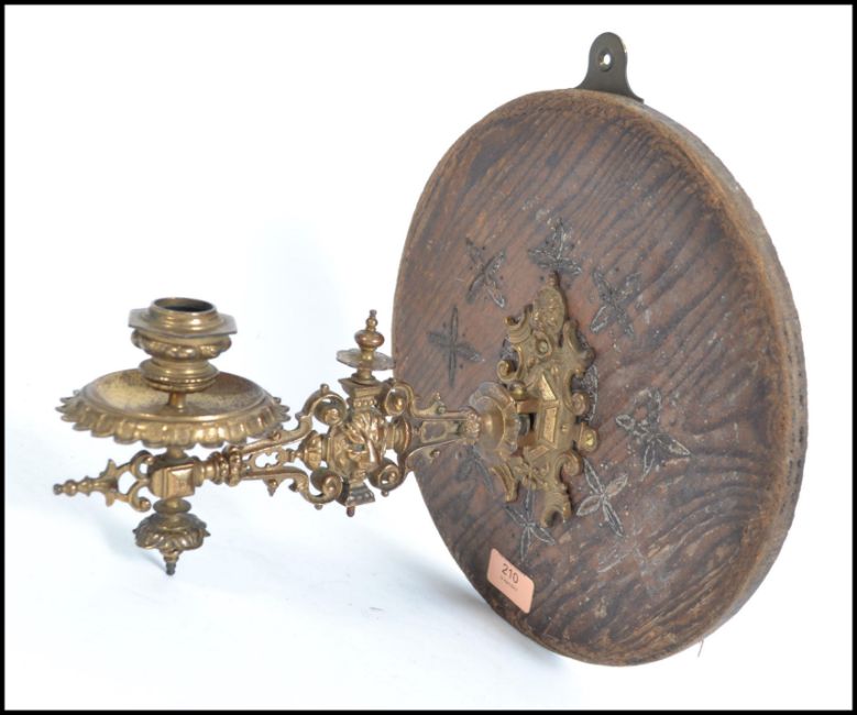 A 19th century brass hinged decorative brass candle sconce mounted on a carved circular oak armorial shield.