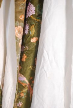 A group of 4 20th century retro velvet curtains with floral pattern each approx 6 feet wide with a 7.5 foot drop along with slightly smaller examples etc
