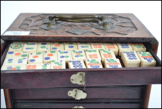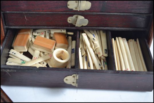 An early 20th century wooden  cased Mah Jong set, the box with slide front revealing trays containing bone and bamboo tiles and appears to have no damage and also a full complement of 146 tiles. Measures 24cm high.