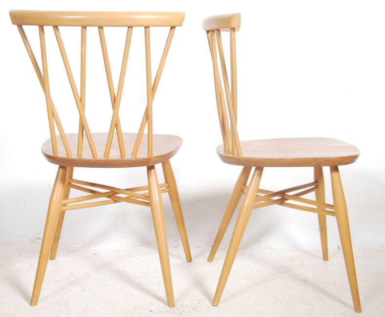 A set of four fantastic vintage  mid 20th Century Ercol Windsor beech and elm cross back candlestick dining chairs, solid seat pad raised on tapering supports united by stretchers.