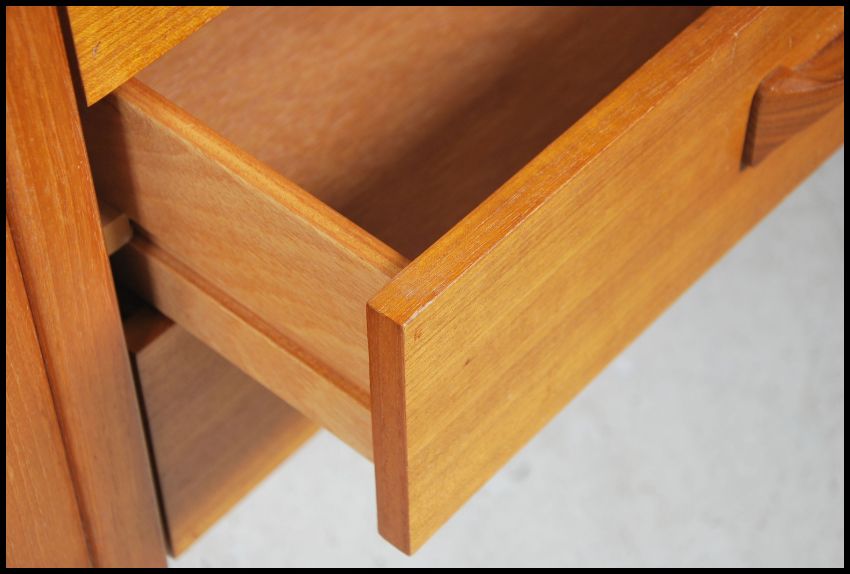 A retro 1970's teak tall sideboard of Danish influence having a series of drawers and cupboards raised on tapering legs united by stretchers. Measures height 140cm x width 145cm x depth 43cm.