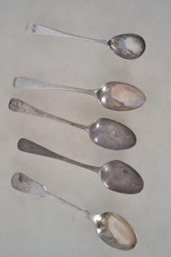 A collection of  silver George 3rd hallmarked teaspoons to include examples by John Round, Sheffield, date letter r 1909, Thomas Wallis and Jonathan Hayne, London 1818, illegible maker, London 1800 & 2 more illegible London 1804 spoons. Total weight 62.9g