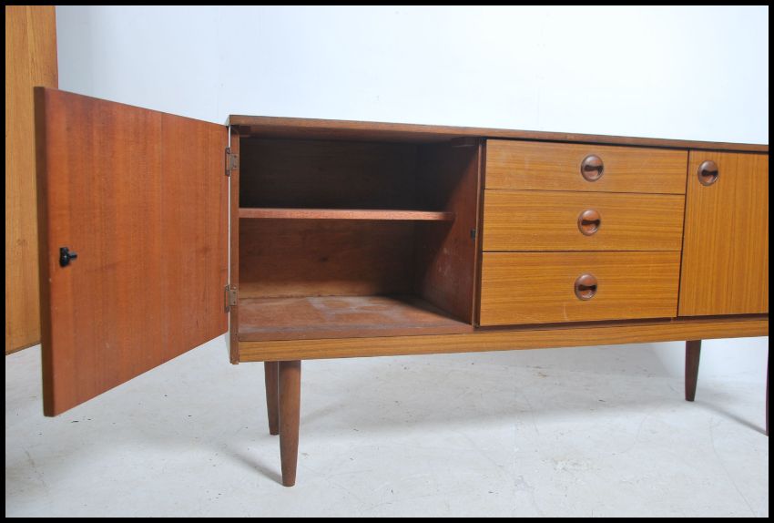 A 1970's retro Danish influenced teak wood sideboard being raised on tapered legs with a series of cupboards and drawers to the wide body. Each with recessed handles. Measures 74cm high x 149cm wide x 43cm deep.