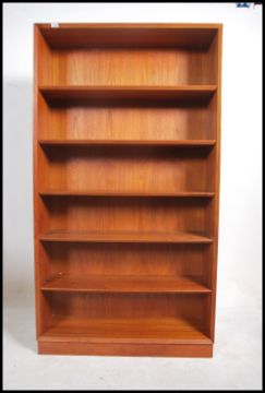 A retro 20th century tall teak open bookcase having chamfered adjustable shelving. Measures height 183cm x width 100cm x depth 30cm.
