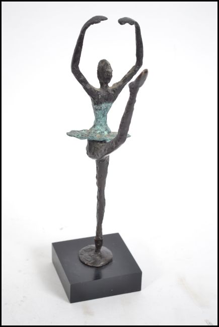 A decorative vintage cold painted cast metal sculpture of a young ballet dancer raised on a single leg in a classic ballet pose raised on a plinth base.