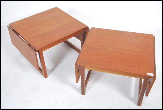 A pair of retro 20th century teak wood drop leaf coffee / occasional tables. Each table fitted on tapering legs united by stretchers. Measures height 36cm x width 94cm x depth 50cm.