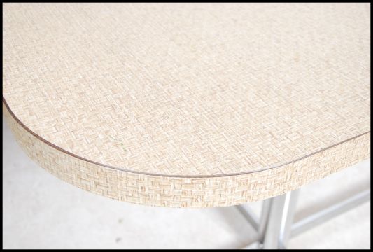 A 1950's American style chrome and formica dining table having chrome pedestal support, the formica of faux rattan design. Measures height 74cm x width 68cm x depth 106cm.