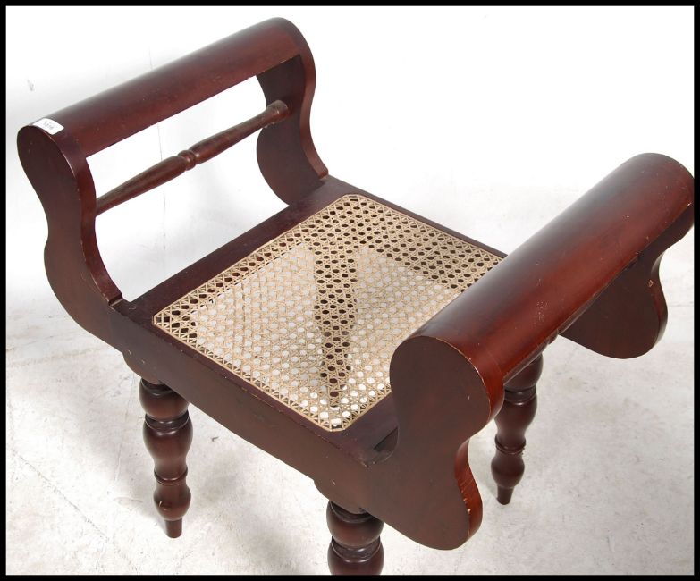 An antique style bergere caned hardwood window seat - piano stool being raised on turned legs with shaped elbow supports and cane worked seat to centre. Measures 69cm high x 77cm wide x 46cm deep.