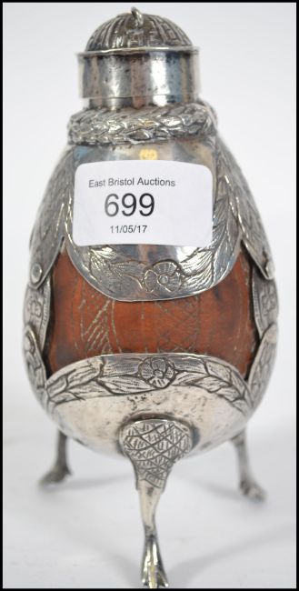 A silvered covered Matte drinking gourd. The gourd having a fret pierced silver metal cover. Raised on tripod feet. Weighs 201 grams and measures 16 cms high.