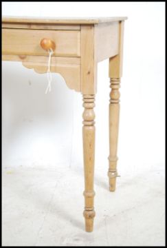 A Victorian country pine writing table being raised on turned legs with single drawer to the frieze having flared edge top above. Measures height 76cm x width 90cm x depth 49cm.