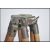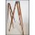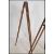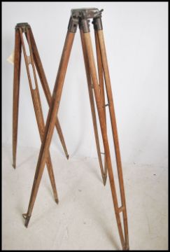 A pair of retro wooden mid century Industrial issue tripods, each with three legs, metal bindings having tapering form. Ideal for theatre lights etc. Measures height 155cm.