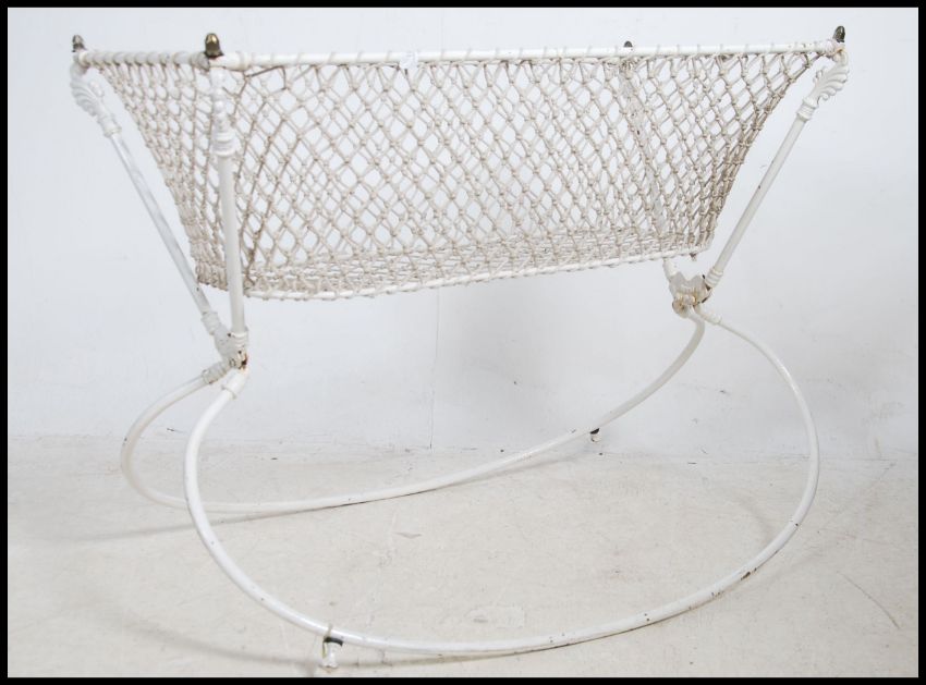 A 19th century cast iron childs rocking crib having metal work frame painted white and rope woven crib base atop. Measures 73cm x 91cm wide x 47cm deep.