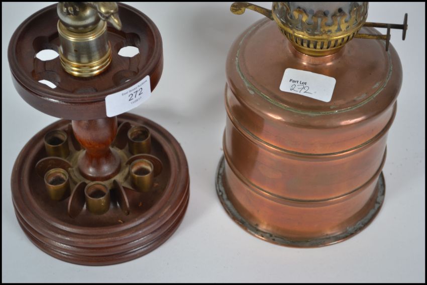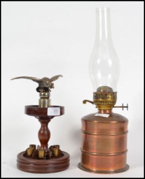 An unusual scratch built cigar holder surmounted with a brass eagle together with a vintage lamp