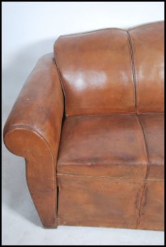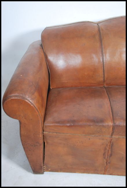 A stunning 1930's Art Deco Moustache back club 3 seat sofa in brown distressed leather being raised on straight legs and studding to the top of the sofa. Measures height 90cm x width 175cm x depth 90cm.