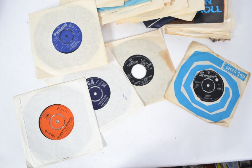 A collection of vinyl 45rpm 7" singles featuring various artists to include Wynder K Frog, The Troggs, Marianne Faithful, The Walker Brothers, Bob Dylan, Mark Wynter, Keith West, Rick Nelson etc