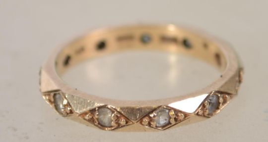 A 9ct gold and paste stone set eternity ring. The concentric stones being inset into lozenge shaped chased edgings. Size M / Weight 2.4g