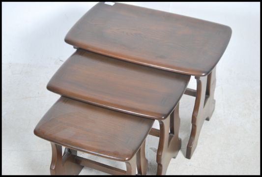 An Ercol elm wood Old Colonnial style nest of tables being raised on lyre shaped supports with elm chamfered edge tops above. Measures 42cm high x 57cm wide x 35cm deep.