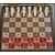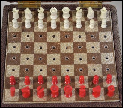 A vintage mid century travelling chess set with white and red pieces in hinged top travel case