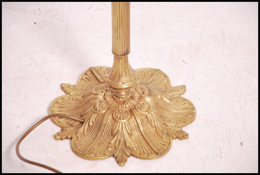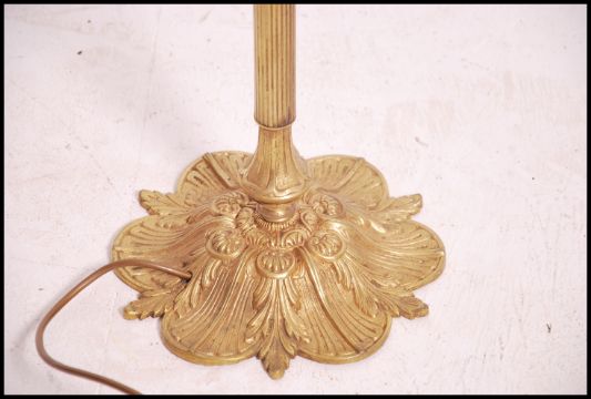 A stunning early 20th century brass standard / floor lamp having a reeded column upright surmounted with a putti raising a twin point light with a mottled green scalloped edge glass shade. Measures 167cm high x 38cm wide.