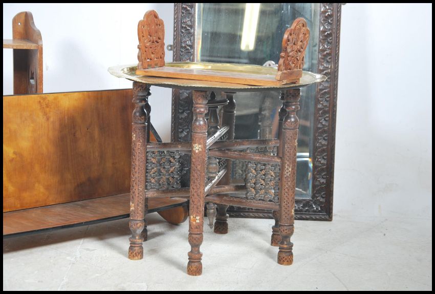 A collection of furniture to include a Chinese brass top opium table being raised on a folding base, a small open window bookcase cabinet, metamorphic folding book stand and a 1930's Art Deco book trough of large form, vintage leather gladstone bag and a blue metal small suitcase. Measures 134cm high x 51cm wide.