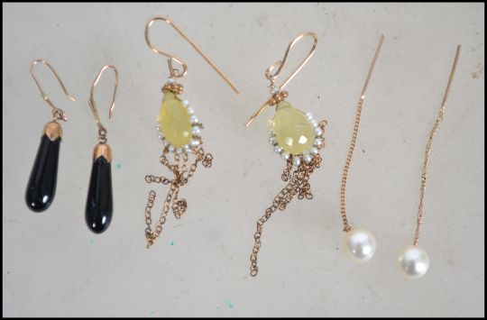A pair of 14ct gold ladies vintage earrings with citrine teardrop adornments together with 2 other pairs to include pearl and ebony. Total weight combined 4.2g