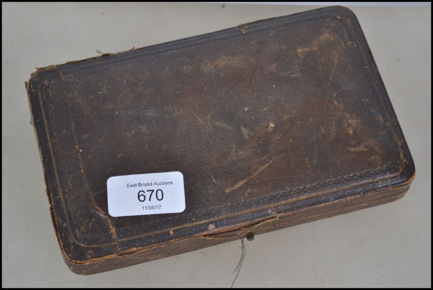 A leather cased silver hallmarked manicure set. Birmingham assay mark, G & C Ltd makers mark and dating to 1919.