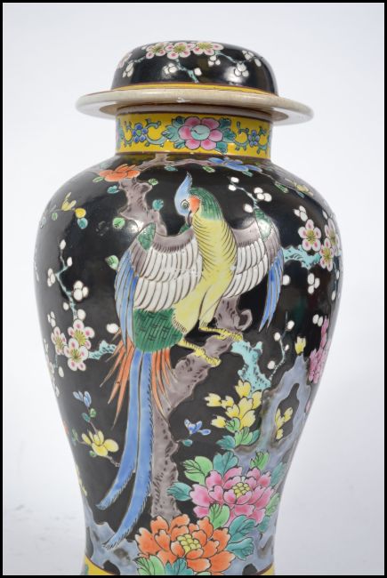 A large early to mid 20th century Chinese lidded ceramic vase heavily decorated with birds of paradise and foliate. Measures 38cm high.