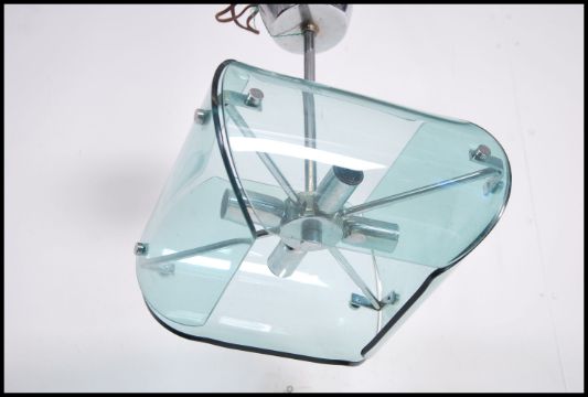 A retro contemporary 20th century glass ceiling lamp of square form having an atomic space age mount with bracket atop