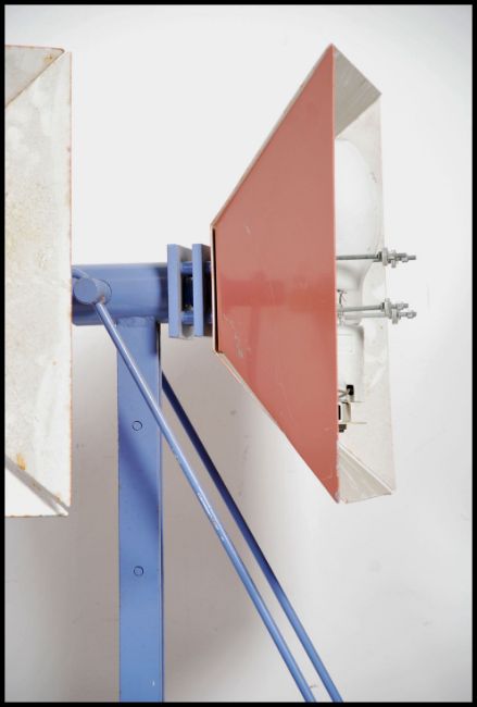 A set of 3 late 20th large wall mounted Industrial bracket uplights, having a two-tone colour scheme of mauve and crimson. Made from a heavy steel bracket and sheet steel shade consisting of angular forms. Believed to be recovered from a factory around the Bristol docks area. Matching pairs in lots 1110 and 1120. Measures height 117cm x width 50cm x depth 40cm.