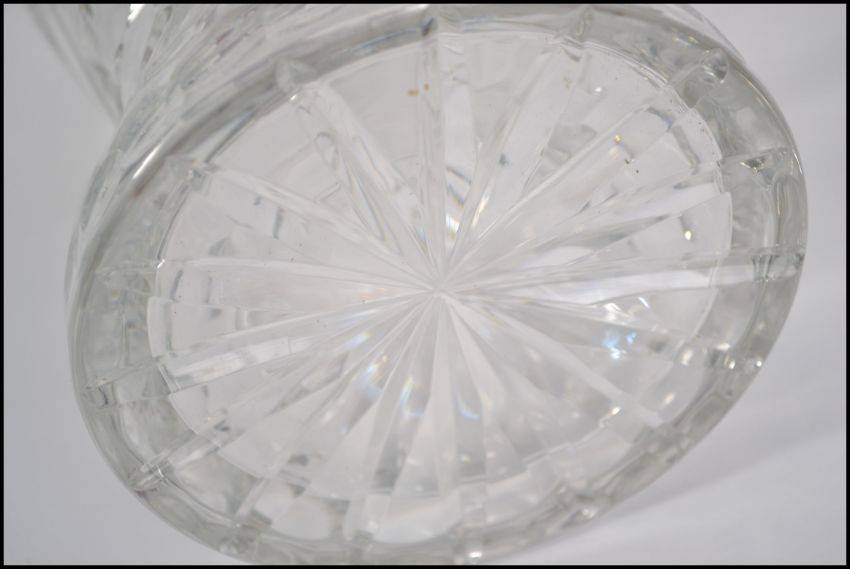 A pair of large crystal cut glass cases with unusual star design. Thes vases of bulbous form with waisted centres. Unsigned, possibly Edinburgh. Measures 27 cms high x 15.5cms diam at top