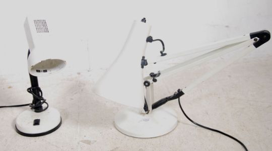 A retro white Anglepoise desk lamp raised on circular base with a conical shade together with a deck top gooseneck lamp.