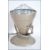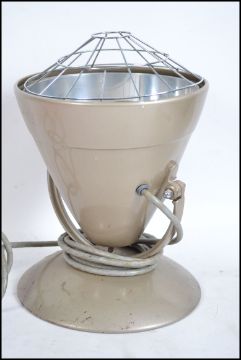 A retro mid 20th century heat lamp, having a circular base with an atomic shaped conical shade, makers mark for Barber.