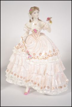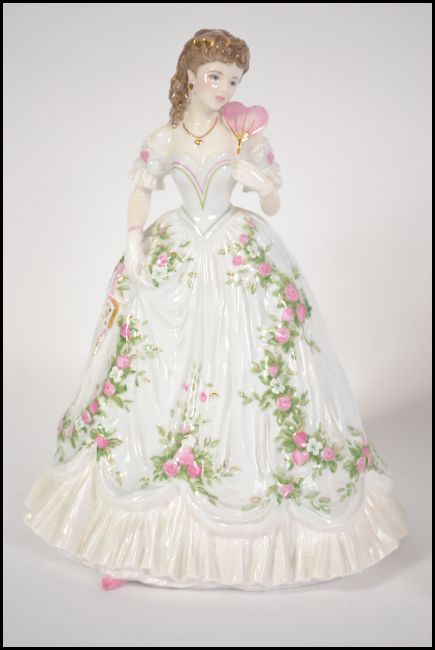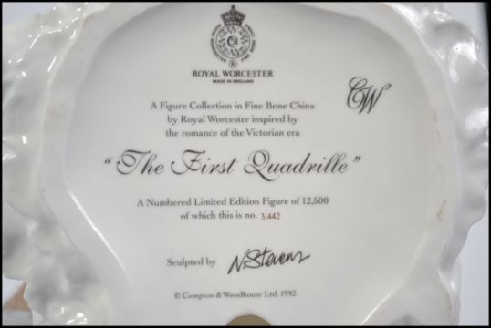 A collection of 3 Royal Worcester figurines to include The Fairest Rose by N Stevens 4917 / 12500, Queen of Hearts by N Stevens 7188 of 12500 & The First Quadrille by N Stevens 3442 / 12500. One with box and certificate. Measures 23cm high.