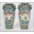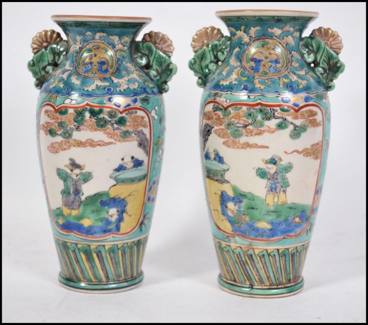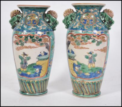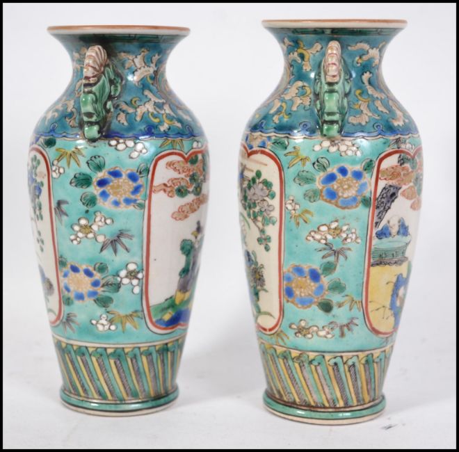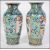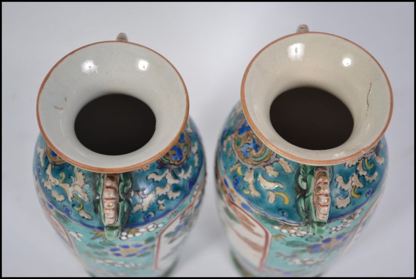 A pair of 19th / 20th century Chinese famille rose hand painted vases on blue ground with foliate panels to the reverse and elders to the other.