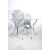 An antique style large cast metal garden patio table together with a matching pair of garden chairs, all with shabby rustic painted finish