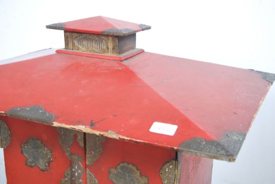 A 19th century, possibly earlier large Japanese lacquered table shrine cabinet with gilt lattice worked metal mounts to edges and borders. Raised on a plinth base with twin doors and overhanging roof of pagoda form. Measures 80cm High x 69cm Wide x 46cm Deep.