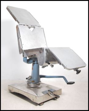 A good mid century Industrial / medical x-ray examination table having multiple folding steel adjustable bed with cushions raised on a rise and fall base complete with castors. Notation plaque for makers to side. Measures height 145cm x width 55cm x depth 140cm.