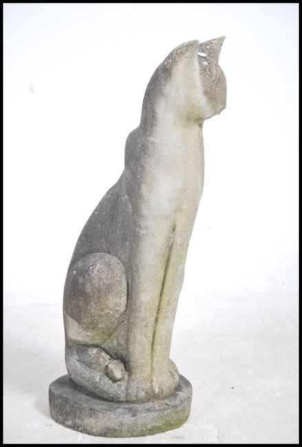 A vintage 20th century reconstituted well weathered   stone garden sculpture of a very proud cat in a seated position. Measures height 58cm x width 20cm x depth 30cm.