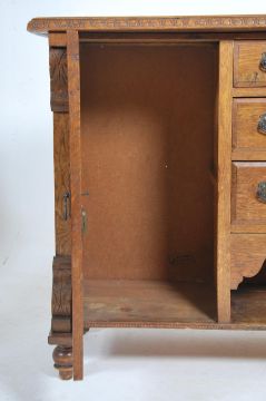 A 1920's Arts & Crafts revival sideboard dresser base having carved doors with short drawers over cupboards beneath