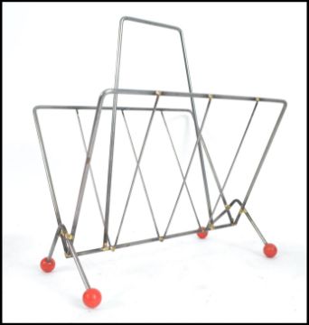 A retro 20th century scratch built atomic magazine rack, with carry handle atop raised on red ball feet.
