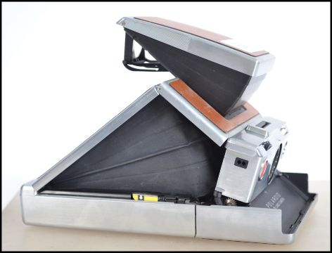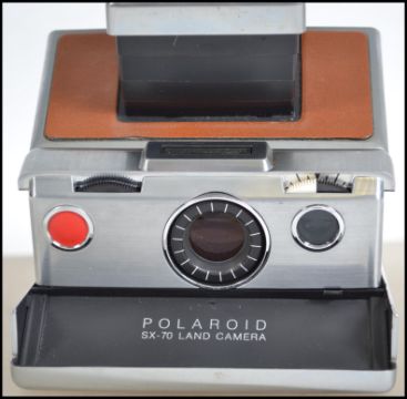 A vintage 20th century early Polaroid SX - 70 folding land camera with chrome and faux leather finish, 18cm x 10cm x 3cm